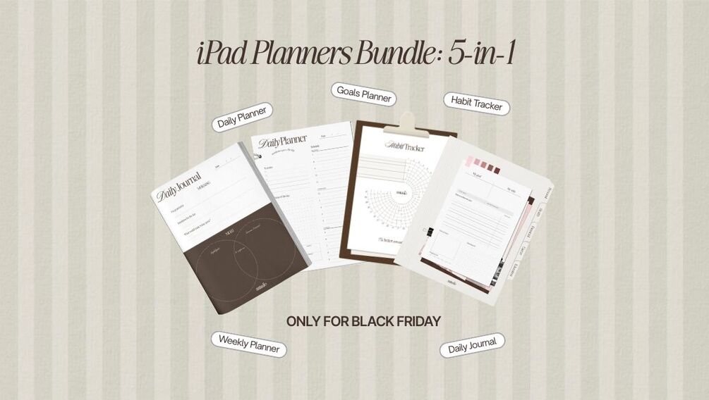 Introducing the Total Productivity Bundle, the essential collection of 5 high-performance digital planners. Designed to work perfectly on GoodNotes, Notabilty, Zinnia and more (iPad and iPhone), this package gives you the structure, clarity, and motivation you need to master every area of your life, from your daily habits to your biggest goals. π―