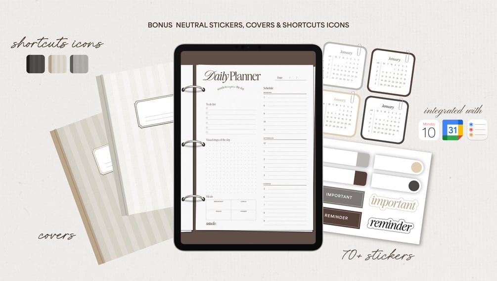✨ PLUS! Get FREE neutral stickers, covers and shortcut icons with the purchase of this planner.